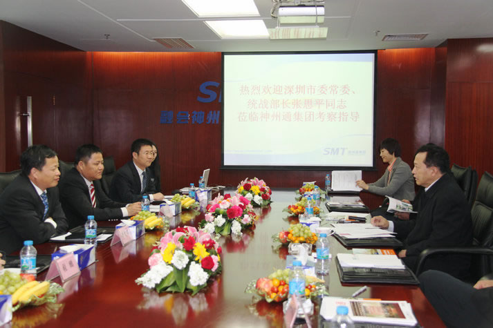 3月9日下午14時30分,深圳市委常委、統(tǒng)戰(zhàn)部長張思平率市委統(tǒng)戰(zhàn)部、市總商會、市科工貿信委、市規(guī)劃國土委等部門相關領導一行,蒞臨神州通集團調研考察。在集團本部會議室,集團董事長黃紹武先生向張思平部長全面介紹了集團現(xiàn)階段發(fā)展情況及未來發(fā)展思路,并陪同市領導對集團成員單位太辰光通信進行實地調研。