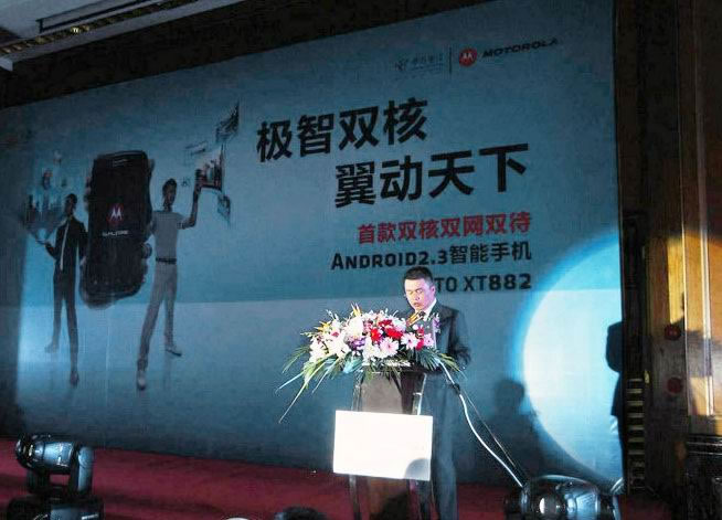 2011年5月31日,中國電信聯(lián)合摩托羅拉在江蘇正式率先首發(fā)全球首款雙核雙網(wǎng)雙待Android ™ 2.3智能手機(jī)MOTO XT882。此次是即中國電信集團(tuán)總部后,首家省電信就XT882上市的發(fā)布會(huì)。