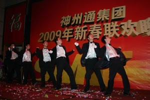 晚會(huì)現(xiàn)場處處洋溢著濃濃的節(jié)日氛圍,舞臺(tái)兩側(cè)懸掛著巨幅對(duì)聯(lián):“創(chuàng)新求未來,同心鑄輝煌”、“攜手創(chuàng)神州,奮進(jìn)謀發(fā)展”。筆力千鈞、催人奮進(jìn)的字眼,預(yù)示著集團(tuán)美好的前景,凝聚著全體神州通人新年的美好祈愿。